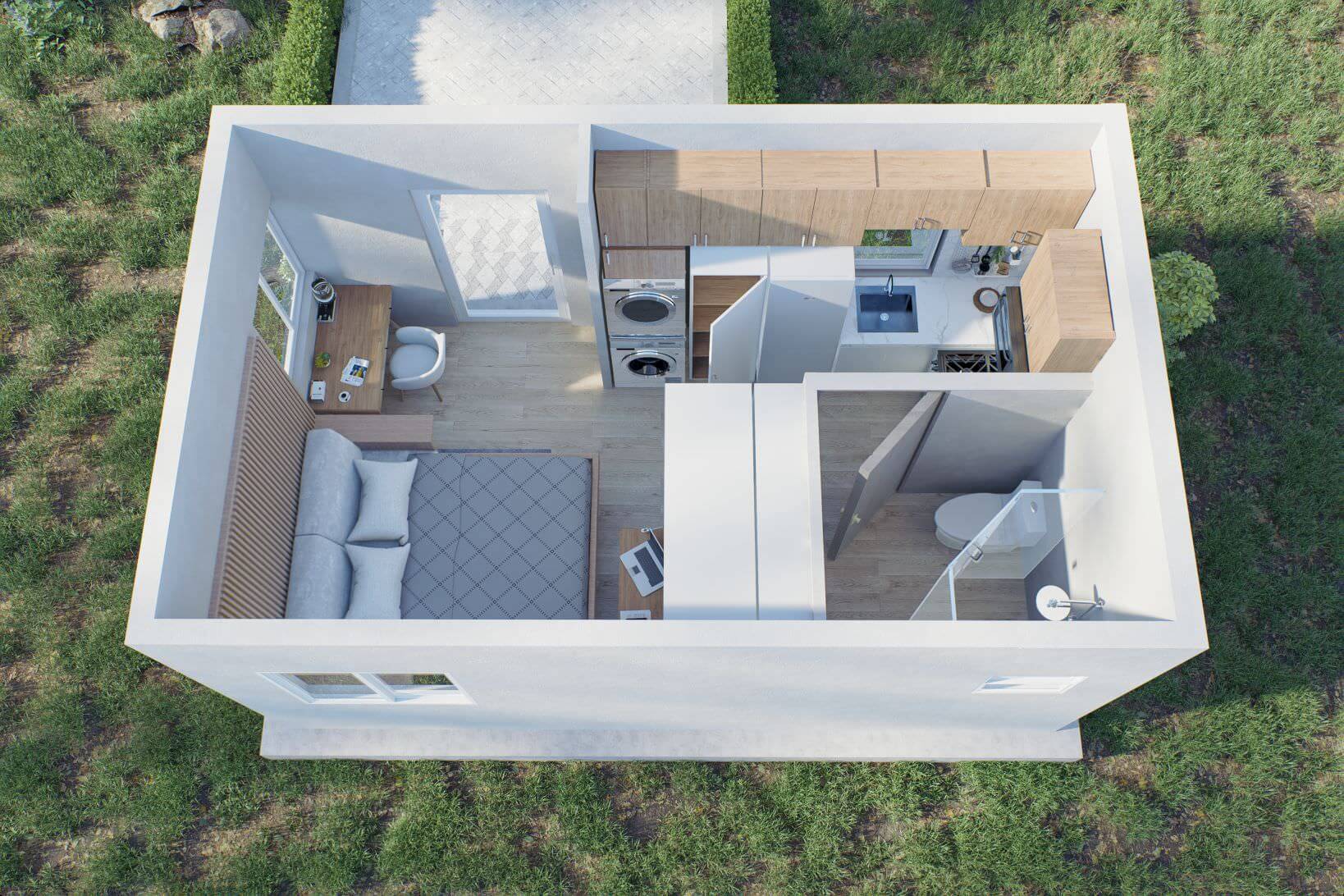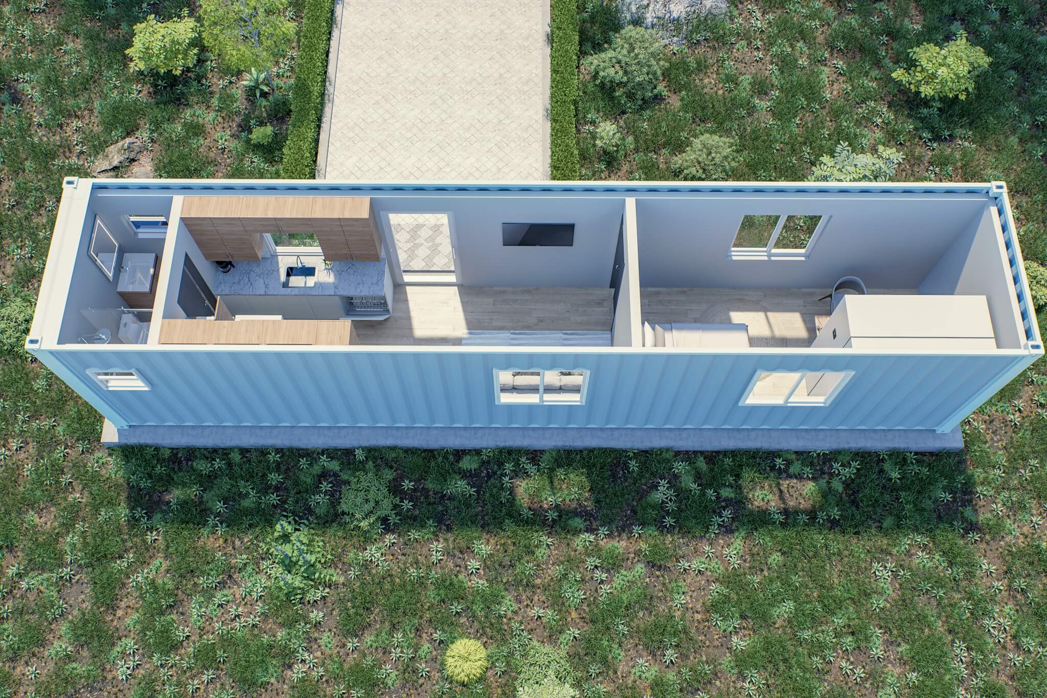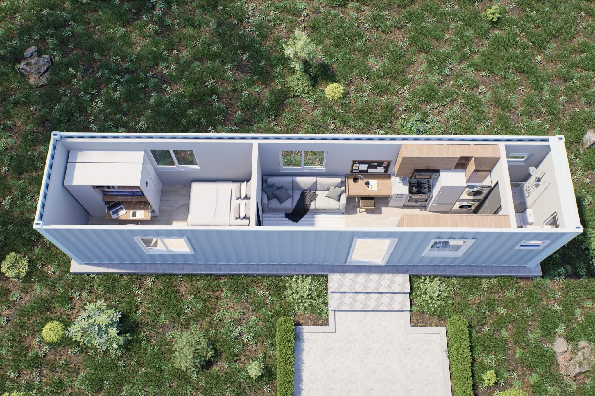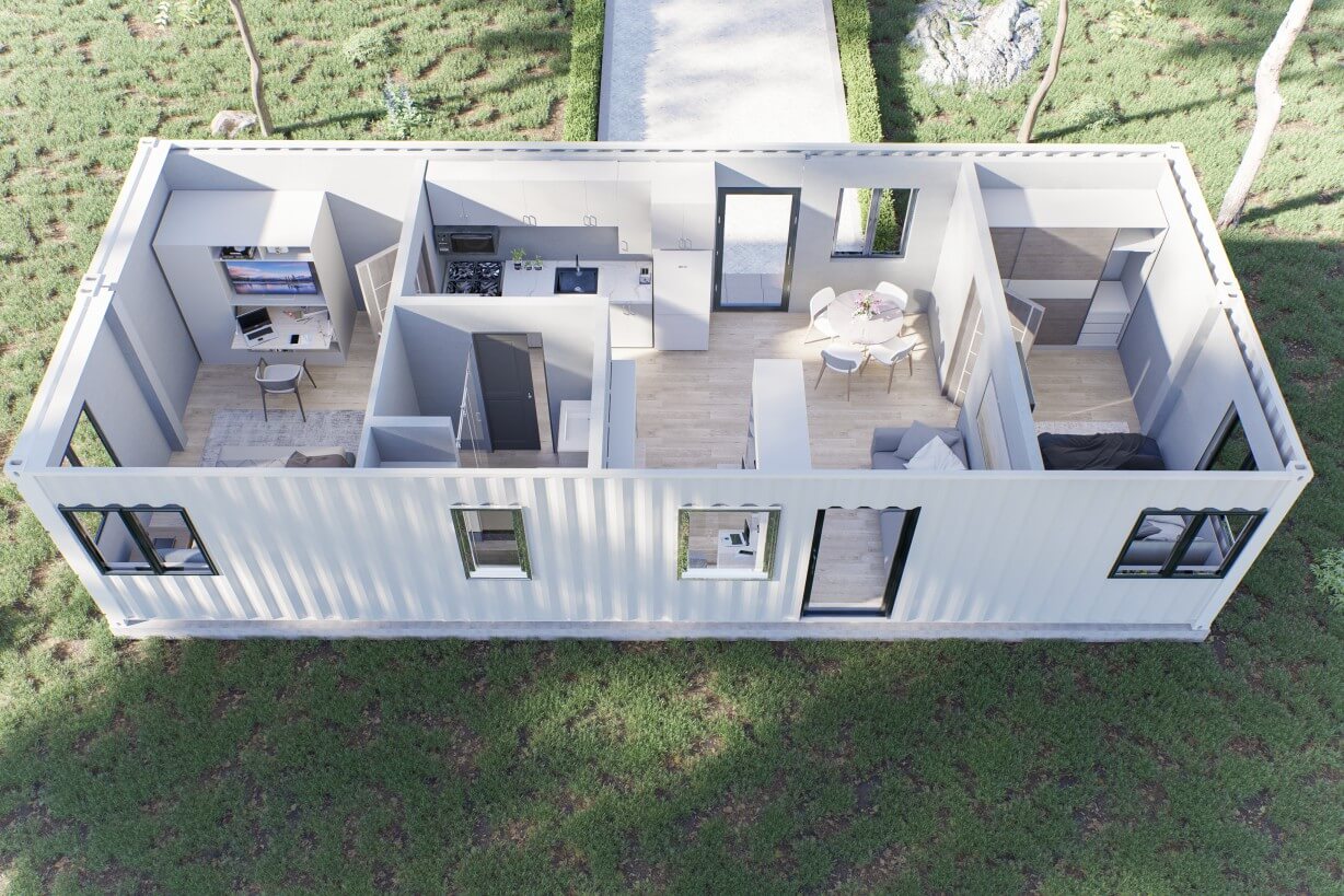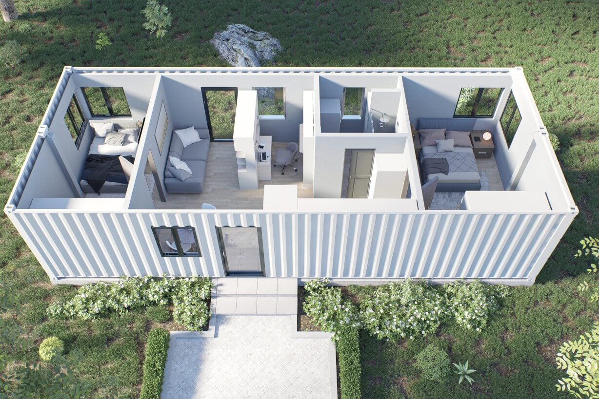 We maximized space in our custom 40ft affordable container home to bring you a 2 bedroom home with room to spare for comfortable living.